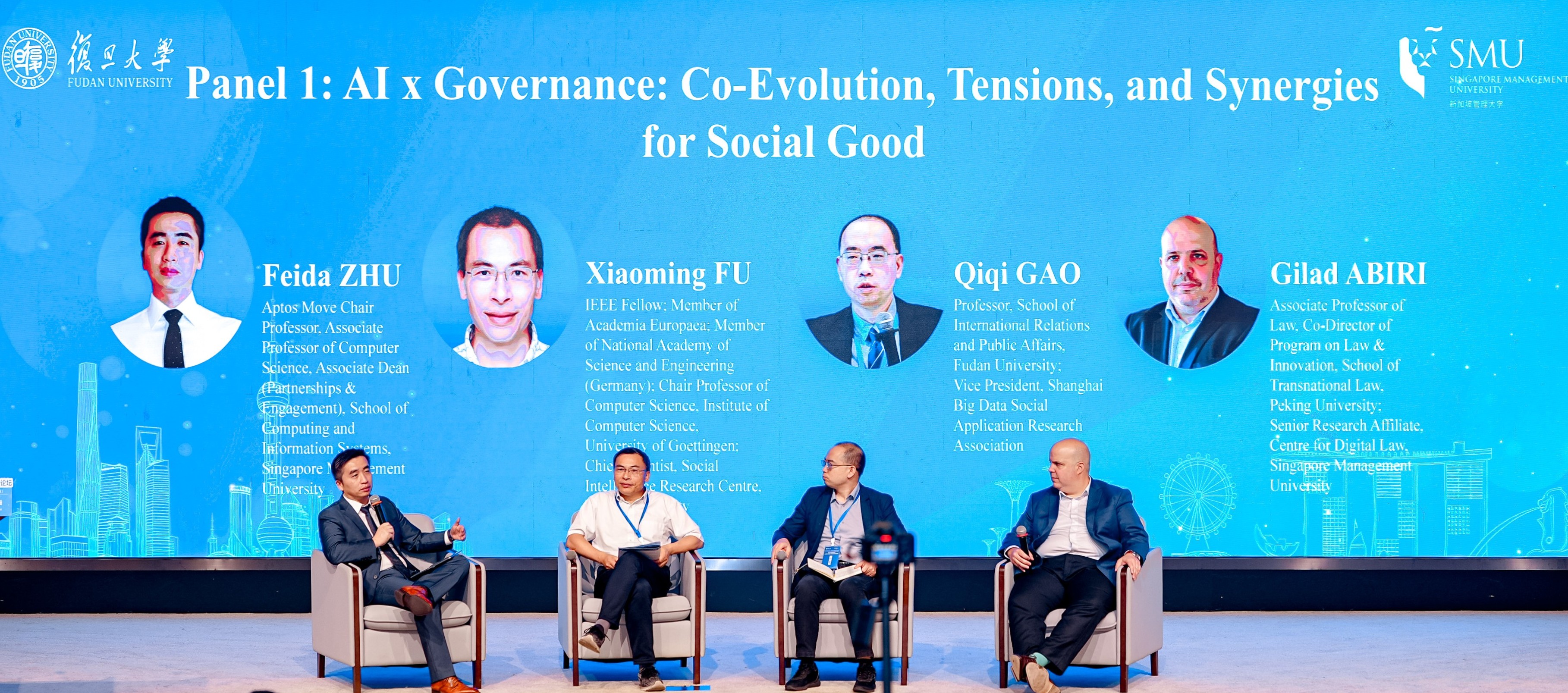Thought leaders from SMU, Fudan, Peking University and the University of Goettingen then took turns to unpack the forum topics and exchange insights. University of Göttingen Institute of Computer Science Chair Professor and Fudan Research Centre for Social Intelligence Chief Scientist, IEEE Fellow, Professor Fu Xiaoming, examined social mobility in ancient empires and the digital age through the lens of AI for Social Sciences and Humanities. Associate Dean of SMU’s School of Computing and Information Systems, Associate Professor Zhu Feida, discussed how collaborative intelligence and tokenised economies could drive a sustainable digital future. Peking University School of Transnational Law Associate Professor of Law and SMU Centre for Digital Law Research Fellow, Associate Professor Gilad Abiri, analysed the normative frameworks for AI legitimacy.