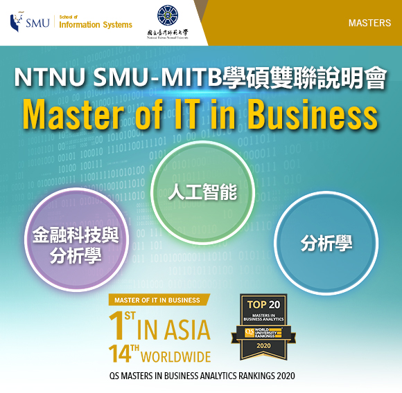 2020年8月入學申請季已經開始啦!新加坡管理大學MITB線上課程說明會即將開放。屆時MITB張麗芳教授和戴冰天教授將親自為臺師大的同學線上講解,感興趣的同學可點入以下網址,立即報名!